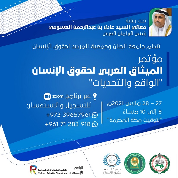 برعاية رئيس البرلمان العربي: تنظيم مؤتمر دولي حول الميثاق العربي لحقوق الإنسان بالتعاون بين جمعية المرصد لحقوق الإنسان وجامعة الجنان برعاية صاحب المعالي السيد عادل بن عبدالرحمن العسومي رئيس البرلمان العربي، تنظم جمعية المرصد لحقوق الإنسان بمملكة…